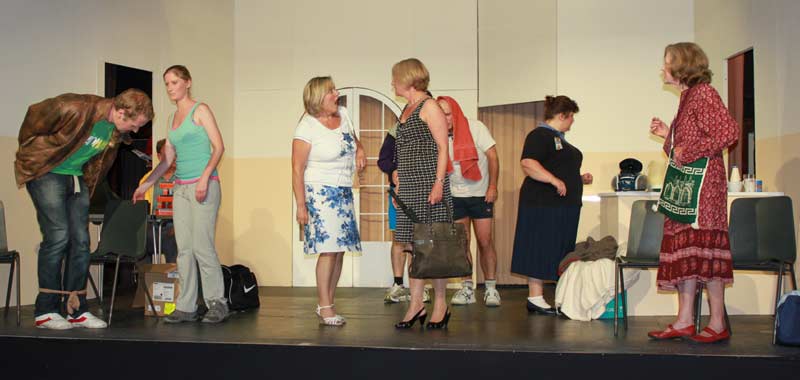 The cast of "Out of Focus", all of whom appear in the following photos: Gill East as Helen Beaver, Katherine Slater as Sue Dixon, Liz Slater as Evonne Duckworth, Janet Tolputt as Kath Enfield, Chris Briant as Bob Enfield, Chris Roberts as Leonard Trotter, David Mayo as Wayne Bryant, Doug Sheppard as David Wright, and Karen Venn as Linda Hammond.